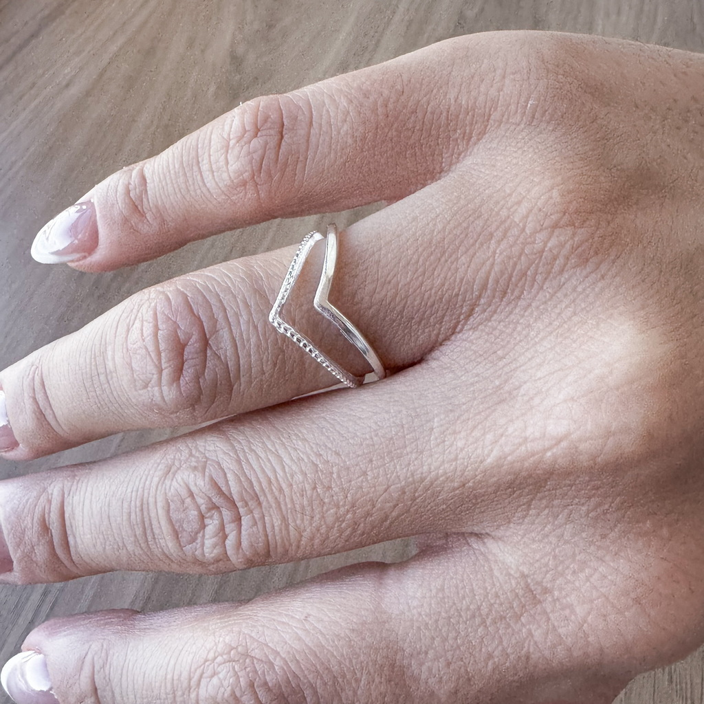 Anel Dois Fios Em V Chevron Duplo é para você que quer adquirir uma jóia delicada, moderna e com desing inovador.