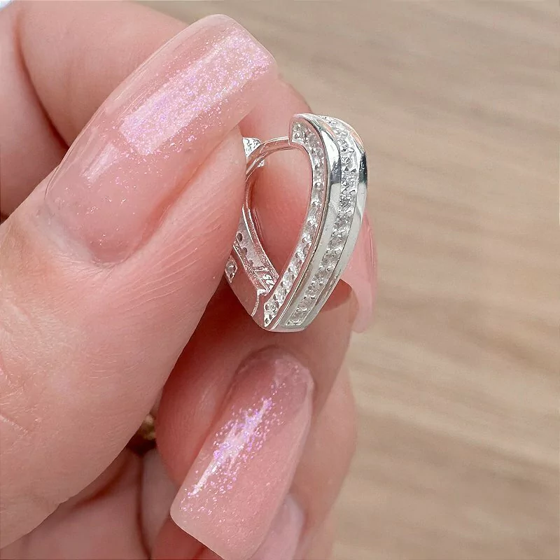 Brinco argola em formato de coração com fio quadrado e cravejada na frente e laterais.