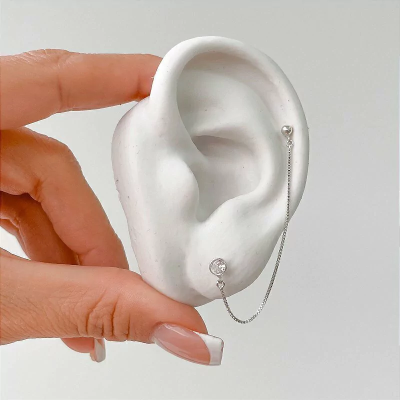 Brinco bolinha 3mm e brinco pedrinha redonda, interligados por corrente veneziana de 6 cm.