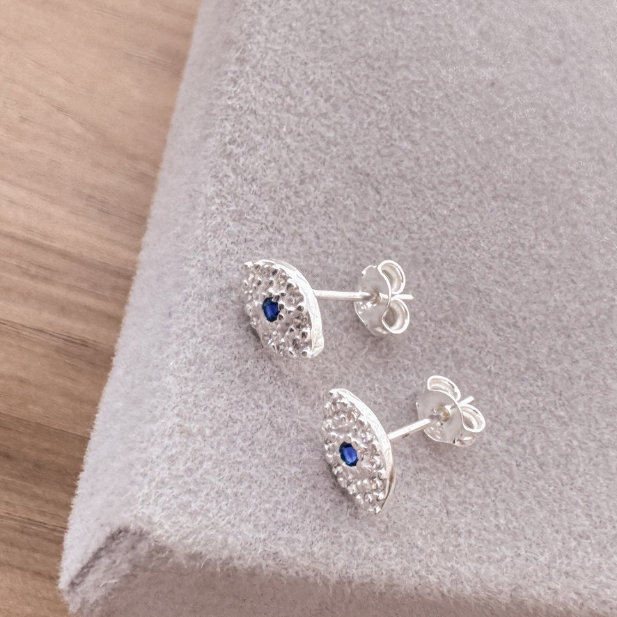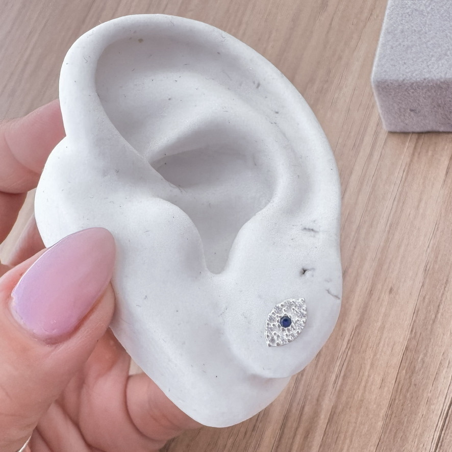 Brinco olho grego cravejado em volta e pedrinha azul no centro.