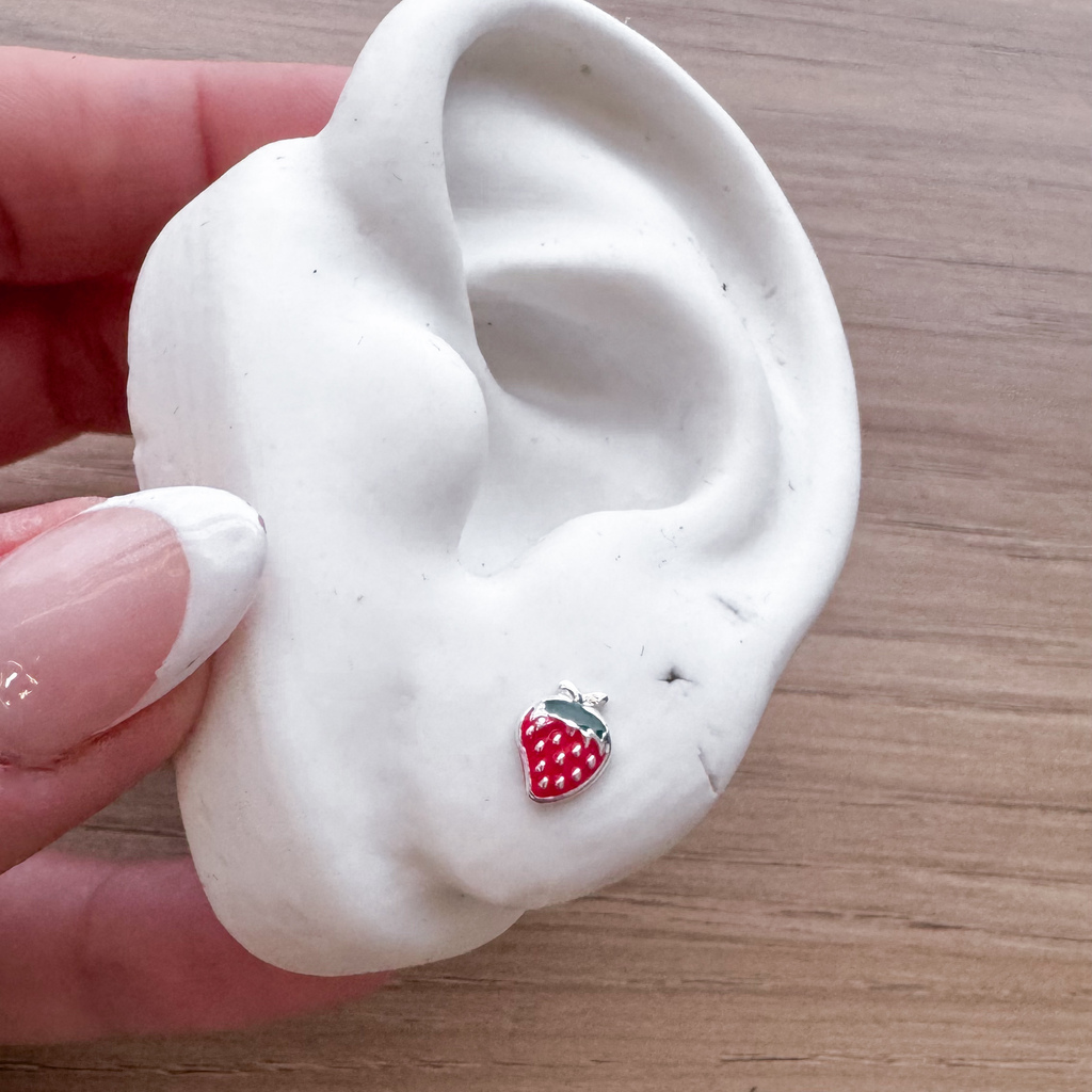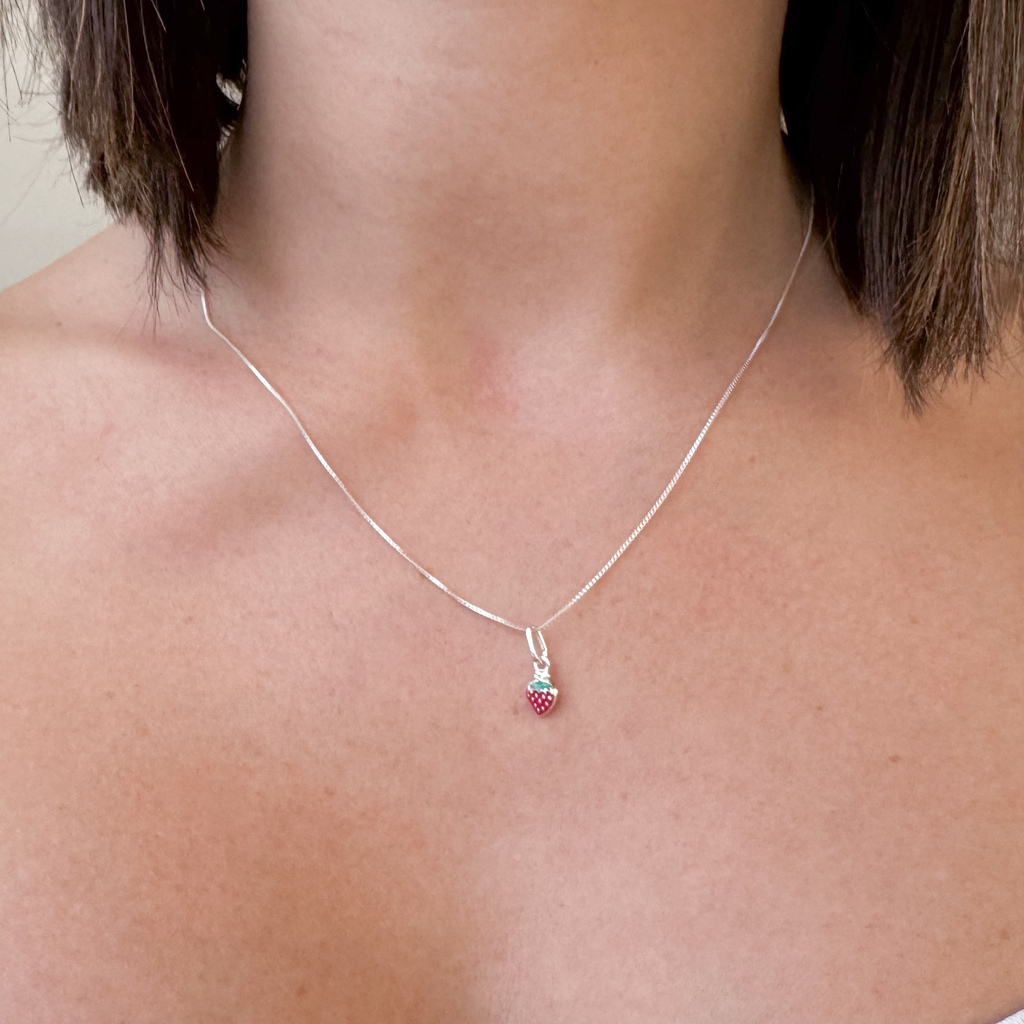 Conjunto composto por corrente, par de brincos e pingente morango.
