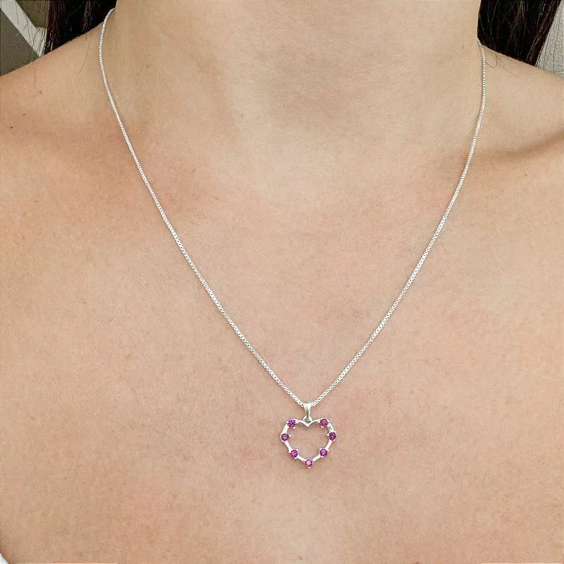 Conjunto composto por colar e brincos em formato de coração vazado com pedras espaçadas.