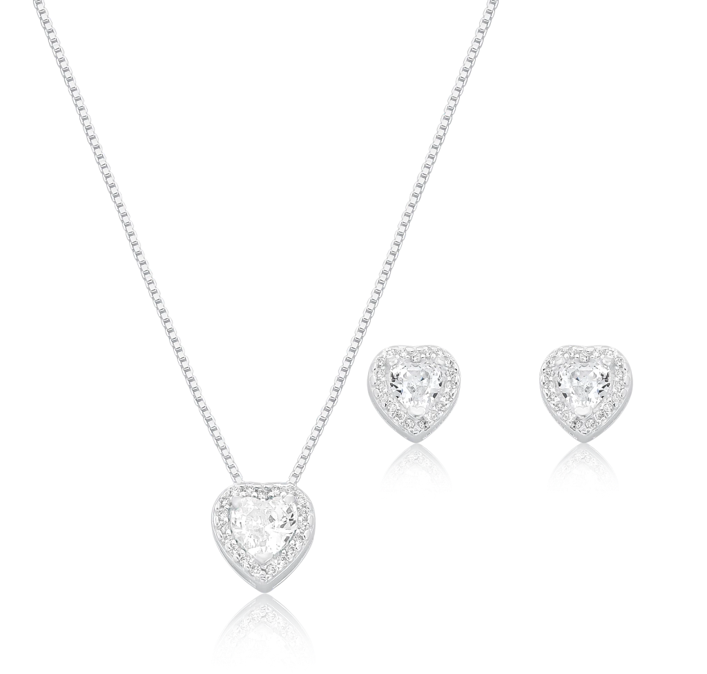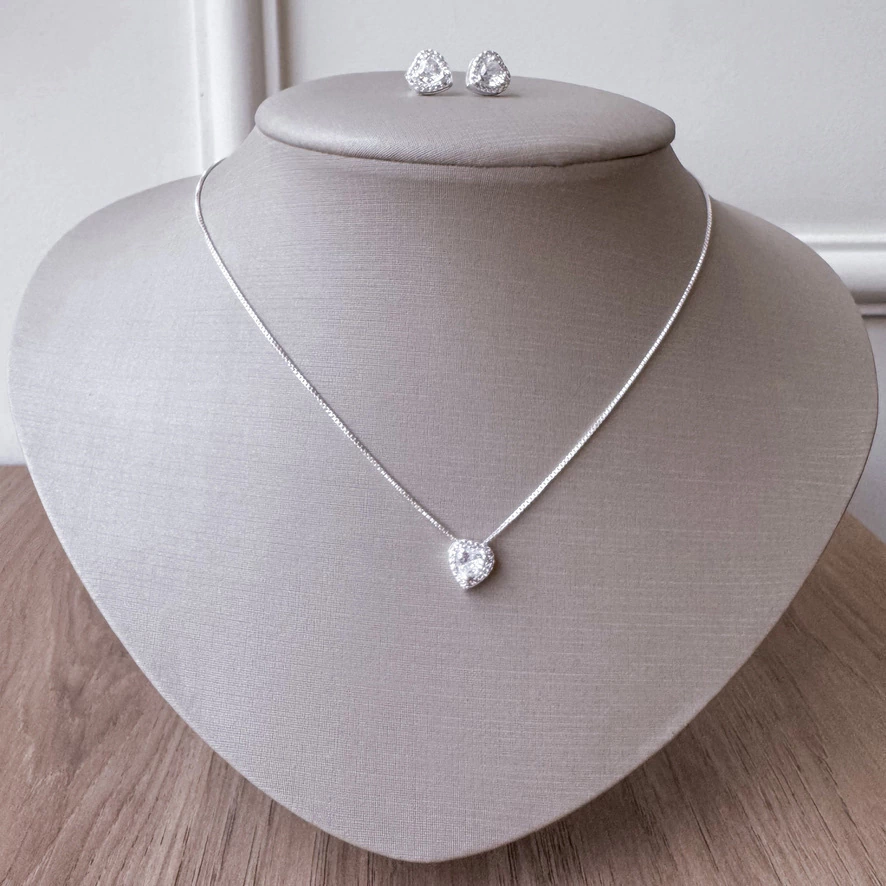 Conjunto colar e brincos de zircônia coração e pedras cravejadas em volta.