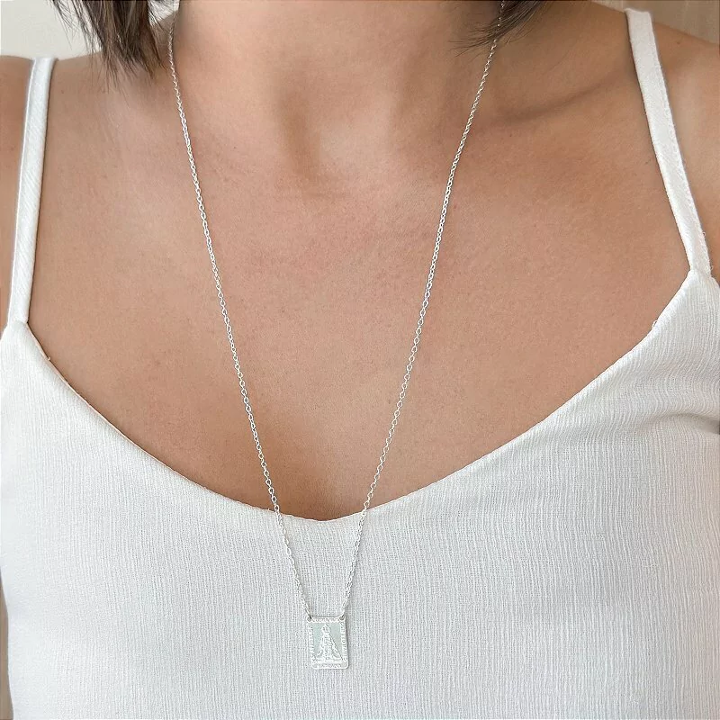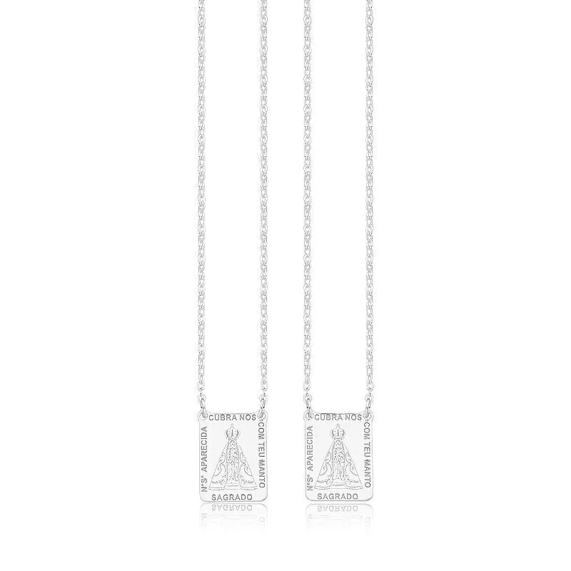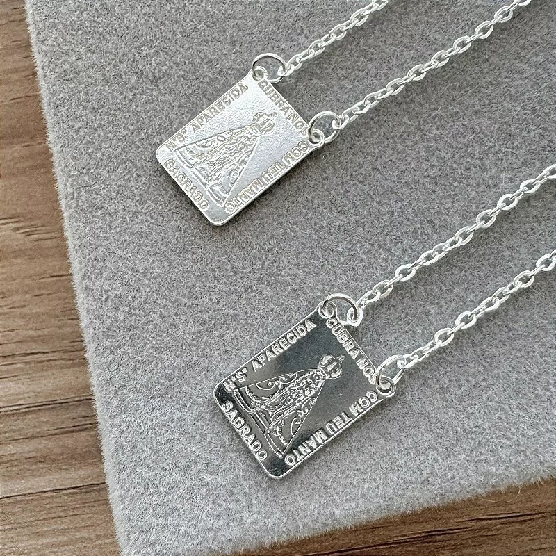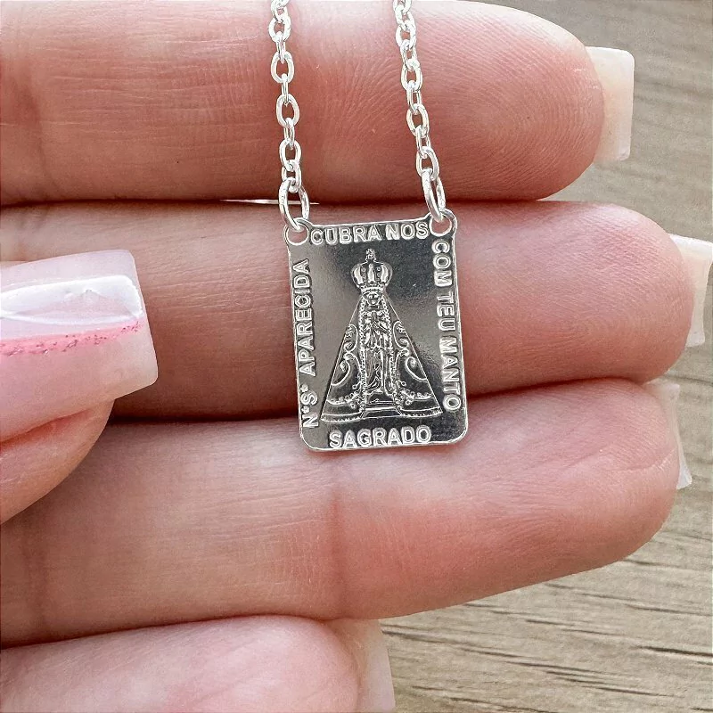Escapulário com a imagem de Nossa Senhora Aparecida e em volta a mensagem "N S Aparecida cubra nos com teu manto sagrado".