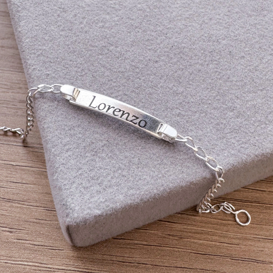 Pulseira infantil com plaquinha retangular com ponta dobravel.