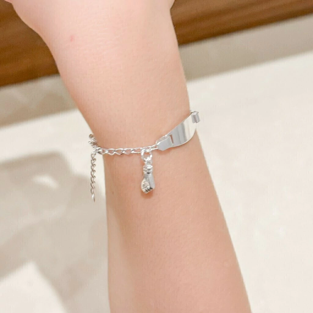 Pulseira infantil com plaquinha para gravação e figa pendurada.