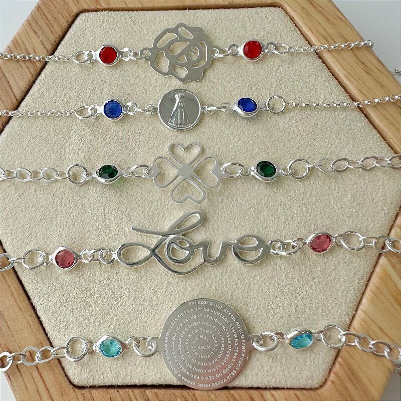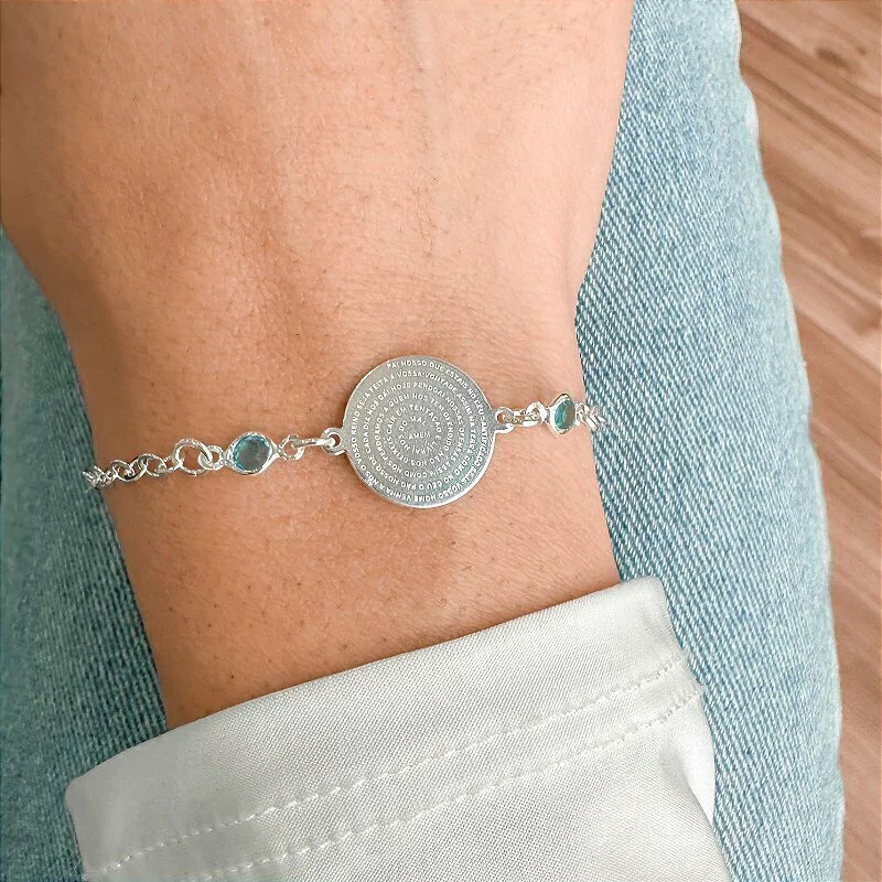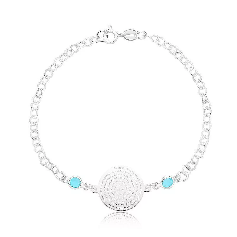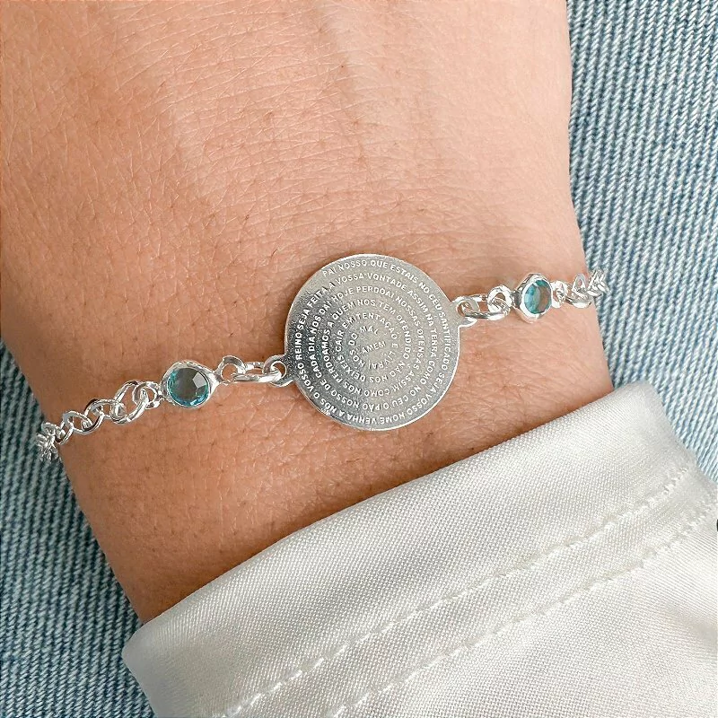 Pulseira com elos redondos, medalha oração pai nosso e duas pedrinhas azul claro.