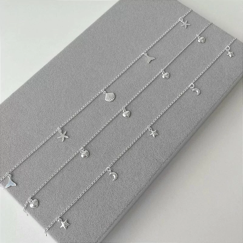 Tornozeleira praia com pingentes de concha, cauda de sereia e estrela do mar.